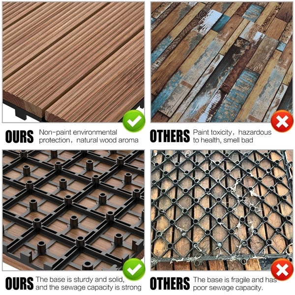 Safe wood building materials: Fully sanded tiles prevent any undesired injury caused by wood splinters. Grooves on each wood slat increase friction and decrease the accidental skidding when the tiles are wet. Also, the plastic base rises the wood board up to allow adequate drainage and ventilation.