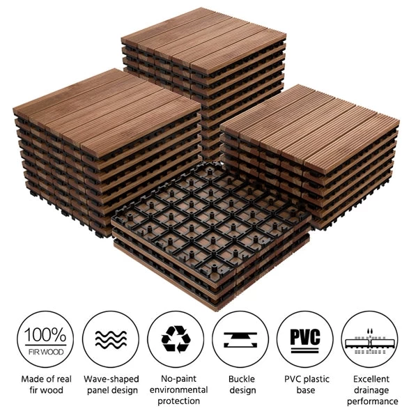 Selected natural fir wood: Our interlocking wood tile is crafted out of natural fir wood and durable PVC. Treated with the high temperature drying process, these wood tiles do not easily mildew even in the high humidity condition.