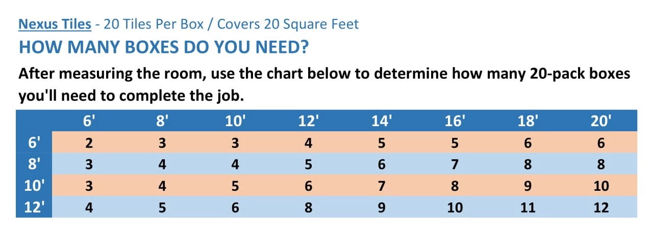 - 20 square feet per box (20 tiles per box).