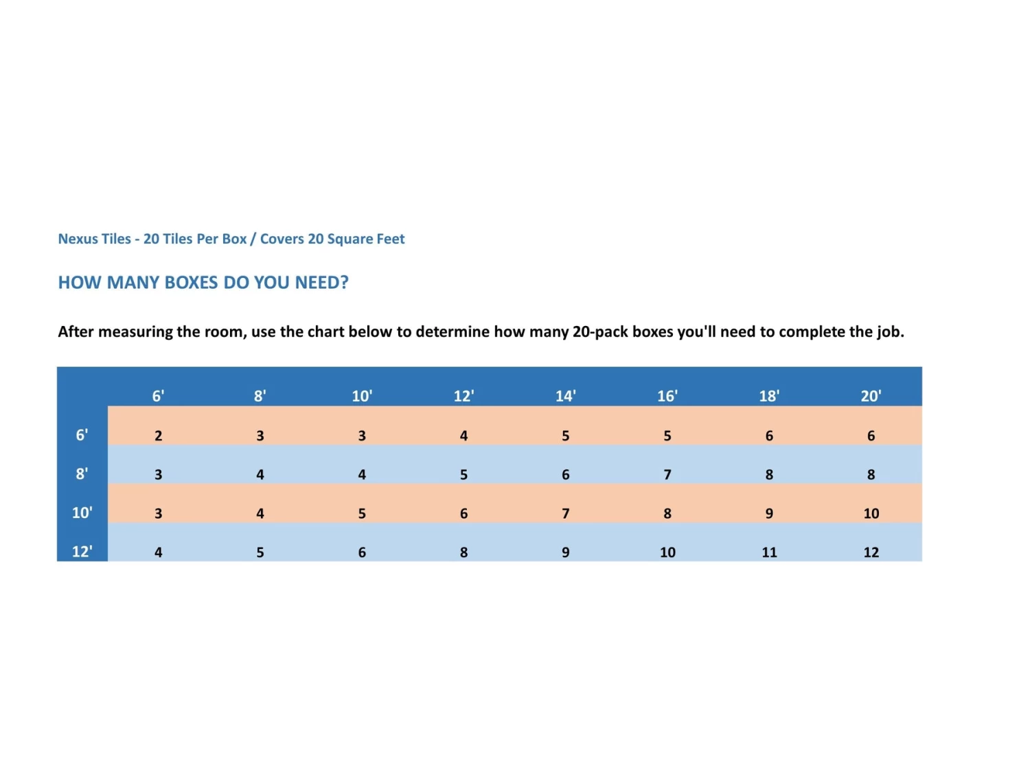 - 20 square feet per box (20 tiles per box).