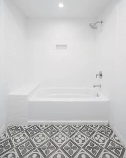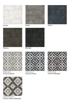 The Chateau Collection is a versatile series that combines 12″ x 24″ and 24″ x 24″ honed porcelain tile with 4″ x 8″ glazed ceramic wall tile. The smoky shades of Canvas, Smoke, Tobacco, Ocean and Midnight pair beautifully with the collection’s four 12″ x 12″ patterned porcelain deco tiles. Use Chateau to create contemporary, industrial-look designs. Soften the look with the geometric and floral motif decos. The series is complete with porcelain and ceramic bullnose, plus a porcelain 2″ x 2″ mosaic.