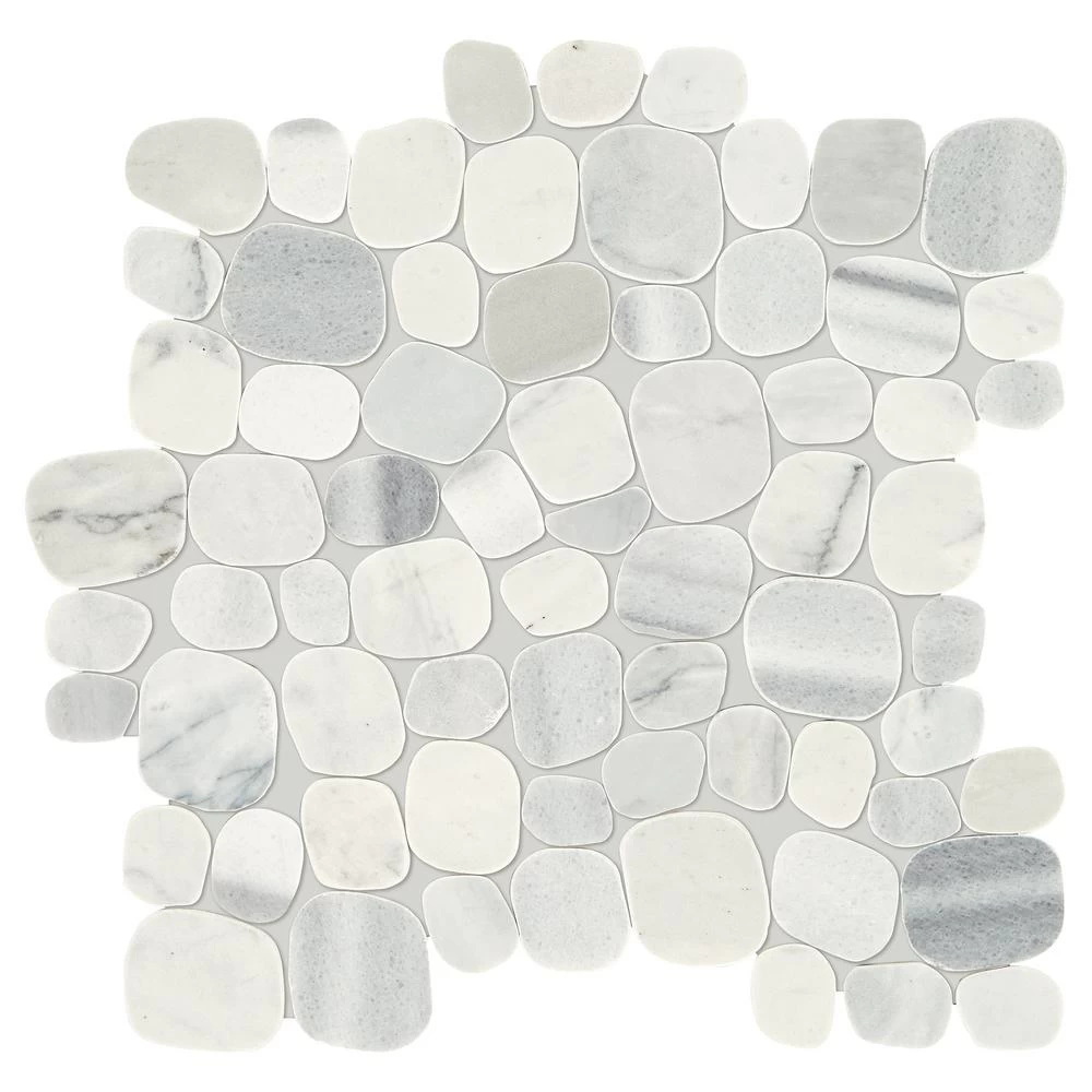 Create a natural, yet high-end look with the Daltile Stone Decor Shadow Flat Pebble 12 in. x 12 in. x 10 mm Marble Floor and Wall Mosaic Accent Tile. Suitable for indoor floor and wall applications including wet spaces like kitchens, bathrooms and showers. Beautiful flat marble pebble mounted mosaic allows for an organic grout install as well, but can also be trimmed to be used as an accent.