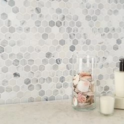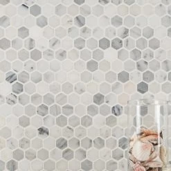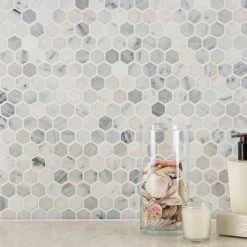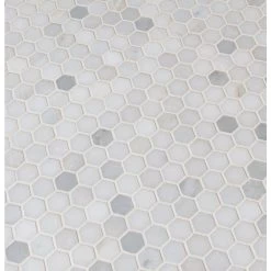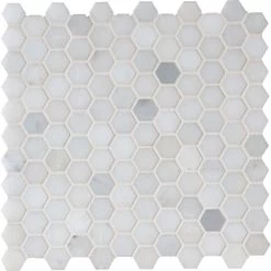 Add a splash of contemporary styling to your decor with this 12 in. x 12 in. x 10 mm. porcelain mesh-mounted mosaic floor and wall tile. This Grade 1 tile lends a refreshing flair to your residential or commercial expanse. It is suitable for use with subsurface heating elements and is semi-vitreous, so installation options are plentiful for floors and walls in bathrooms, kitchens, hallways and walk-in closets. The attractive tile pieces are sized on a mesh sheet for easy installation. Designed at random tones, the Grecian white hexagonal pieces complement traditional and contemporary design styles. Natural stone products inherently vary in color, shade and finish and should be secured with a penetrating sealer. It is recommended to blend tiled from different boxes when installing. Offering supreme style and strength, the impervious, skid-resistant tile absorbs less than 0.5 percent of water. Included per case are 20 pieces.