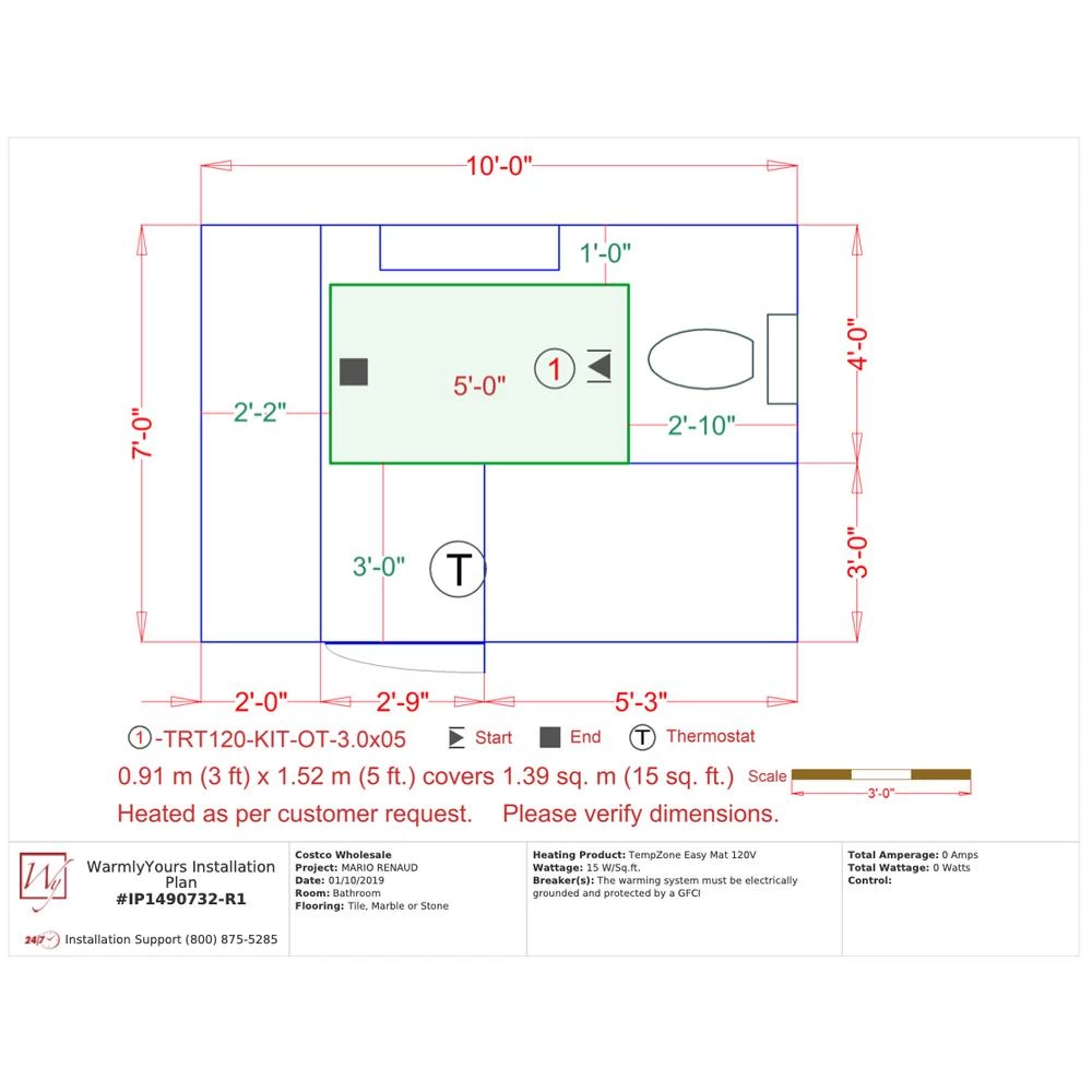 The WarmlyYours floor heating kit with TempZone Easy Mat is designed for applications under tile, stone and hardwood floors. TempZone Easy Mats allow for radiant heating of smaller, simpler areas at an affordable cost. Install radiant heating mats in front of your kitchen appliances and bath fixtures for a warm path of under floor heat where you stand the most. These under floor mats are perfect for providing radiant spot heating for moderately sized bathroom and kitchen floors or just the high traffic cooking areas of larger kitchens, in front of a vanity or in a powder room. Along with comes the programmable nSpire Touch which features a 3.5 in. full color touchscreen and a modern design that instantly augments any room’s style. With an integrated Install Wizard, it’s never been easier to set up a radiant heating system according to your preferences and schedule. The nSpire Touch allows you maximum control over the floor temperature with 4 programmable events for each day of the week, which is great for Goldilocks households where there will be frequent adjustments to the temperature or thermostat’s schedule until it’s just right. This thermostat puts the control where it belongs, at your fingertips. Includes floor sensor.